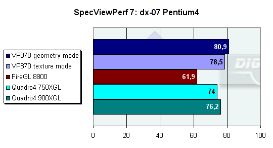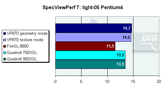 В этом сбалансированном тесте много как текстур, так и достаточно сложной геометрии, поэтому разницы между режимами практически нет, в целом же, картина опять в пользу VP870. На этот раз разница между VP870 и Quadro4 составила 8%. Это хороший знак для большинства реальных сбалансированных приложений.