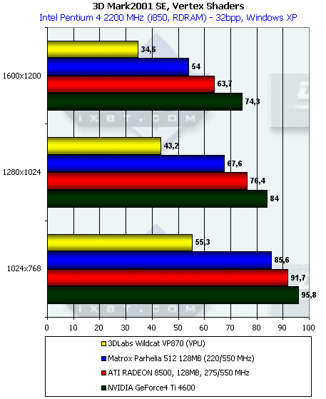 Проигрыш по всем статьям. И это при столь обещающих результатах теста на предельную пропускную способность по треугольникам. И это, при наличии 16 скалярных вершинных процессоров. Либо что-то не в порядке с драйверами, либо вершинное железо очень сильно заточено под OpenGL и не может конкурировать с DX ускорителями, либо оно просто-напросто недостаточно производительно. Последнее было бы крайне обидно, но маловероятно.