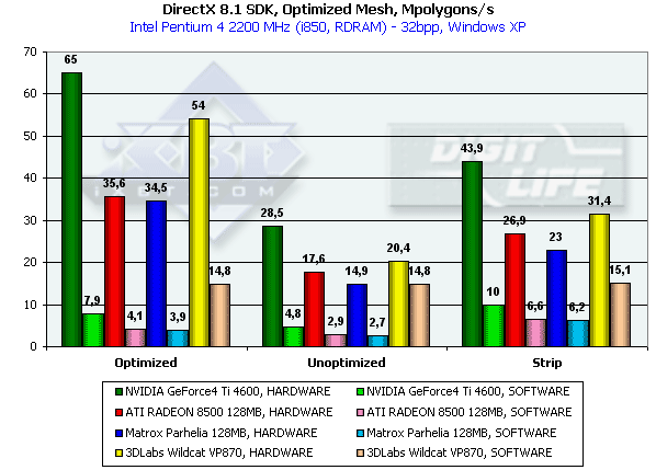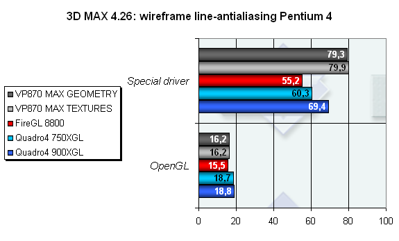 Важная часть тестирования — умение карты правильно и быстро прорисовывать большое количество прямых линий, так называемый каркасный режим работы. И при работе в OpenGL, и при работе под специальным драйвером результаты не зависят от типа оптимизации, причем результаты в OpenGL достаточно низкие. При использовании специального драйвера, в котором, очевидно, используется несколько иной, более выгодный для P10 алгоритм работы, скорость вырастает в разы. При этом прирост скорости позволяет карте забраться на вершину и стать лидером этого теста.