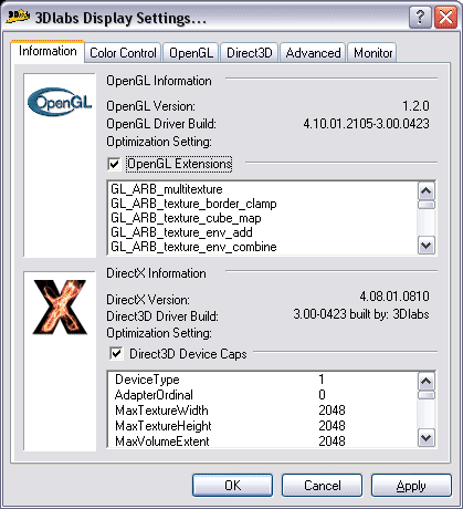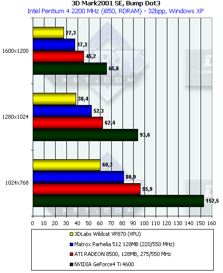 - С точки зрения игровых приложений 3Dlabs Wildcat VP870 выглядит крайне скромно. Впрочем, вполне естественно ожидать этого от профессиональной карты. Оптимизированные под профессиональные пакеты драйверы (достаточно посмотреть хотя бы на список расширений ICD OpenGL, чтобы убедиться в этом), достаточно слабый (неоптимизированный) DirectX 8 драйвер и особенности самого P10, сбалансированного с учетом неигровых применений, не позволяют рассчитывать на высокую скорость в играх.