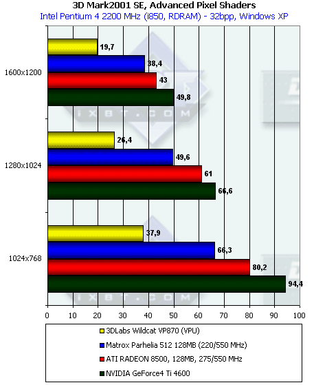 На несложных пиксельных шейдерах P10 умудряется сохранять приемлемую производительность, несколько выигрывая у Parhelia. Это подтверждает полученные при тестировании пиксельных шейдеров в SDK результаты. Но посмотрим и на тест Advanced Pixel Shader.