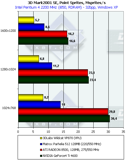 В этой области у P10 все плохо — еще хуже чем у Parhelia. Очевидно, что спрайты эмулируются стандартными треугольниками. С другой стороны, не будем забывать, что подобные скоростные системы плоских частиц имеют пока сугубо игровые применения.
