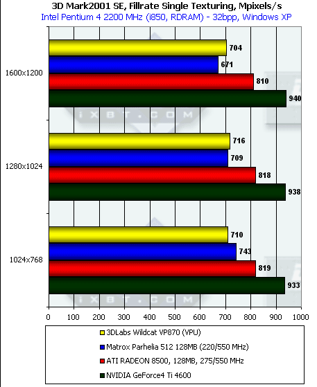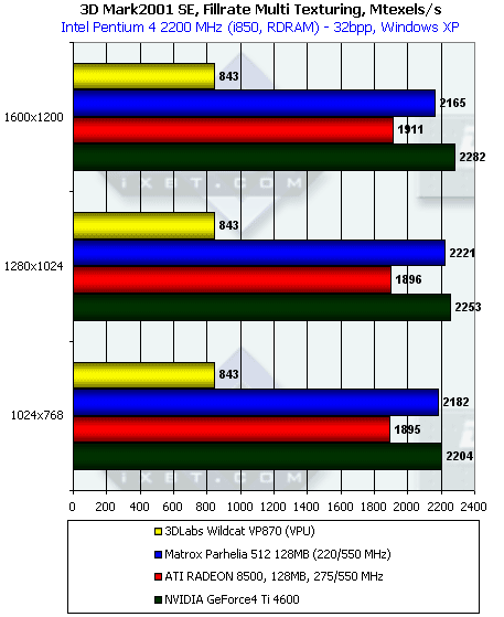 Напомним, что теоретические пределы для данного теста составляют 880 миллионов пикселей в секунду для Parhelia, 1100 для RADEON 8500 и 1200 для Ti 4600 соответственно. Как мы видим, по фактической скорости закраски Parhelia наиболее близко подошла к пиковым значениям, видимо, благодаря 256-битной шине памяти. Точное значение частоты ядра P10 неизвестно, однако, зная, что чип может записывать 4 точки за такт, можно предположить, что оно очень близко к Parhelia 512. Интересно, что с ростом разрешения эффективность закраски Parhelia чуть падает, что говорит о недостаточном совершенстве контроллера памяти.