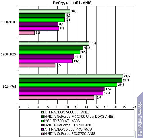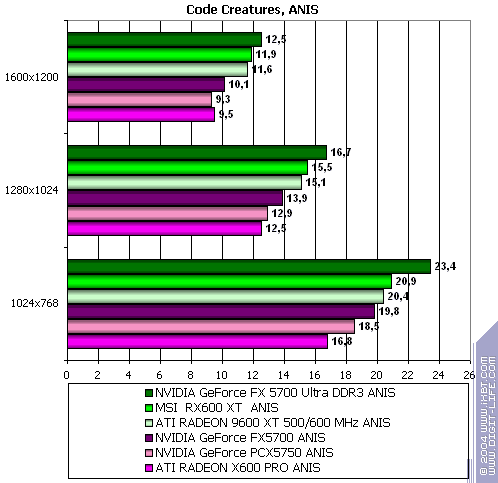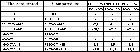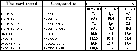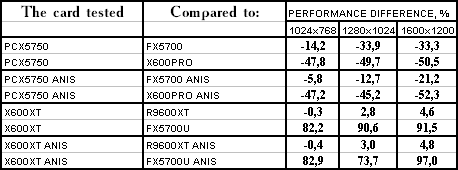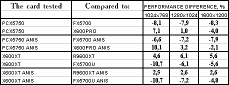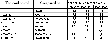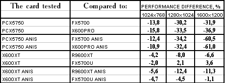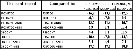 Итак, видно, что PCX5750 почти везде проиграл своему более старшему брату FX5700. Я не буду сразу винить в этом HSI, тут может быть ещё много проблем с драйверами (в т.ч. и системными, не только видео). Но пока результат вот такой не сильно утешительный для этого вида карт. А во всех современных играх с шейдерами он еще и проигрывает сопернику в лице X600 PRO с крупным счетом. Так что, ценовая политика, думаю, должна учитывать это все.