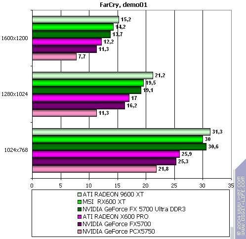 - Fac Cry v.1.1 (Crytek/UbiSoft), DirectX 9.0, мультитекстурирование, demo01 (запуск игры с опцией -DEVMODE), настройки тестирования все Very High.
