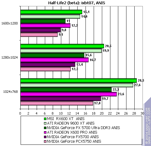 - Half-Life2 (Valve/Sierra) DirectX 9.0, два разных записанных demo (ixbt07 и coast). Тестирование проводилось при включенной анизотропной фильтрации.