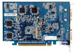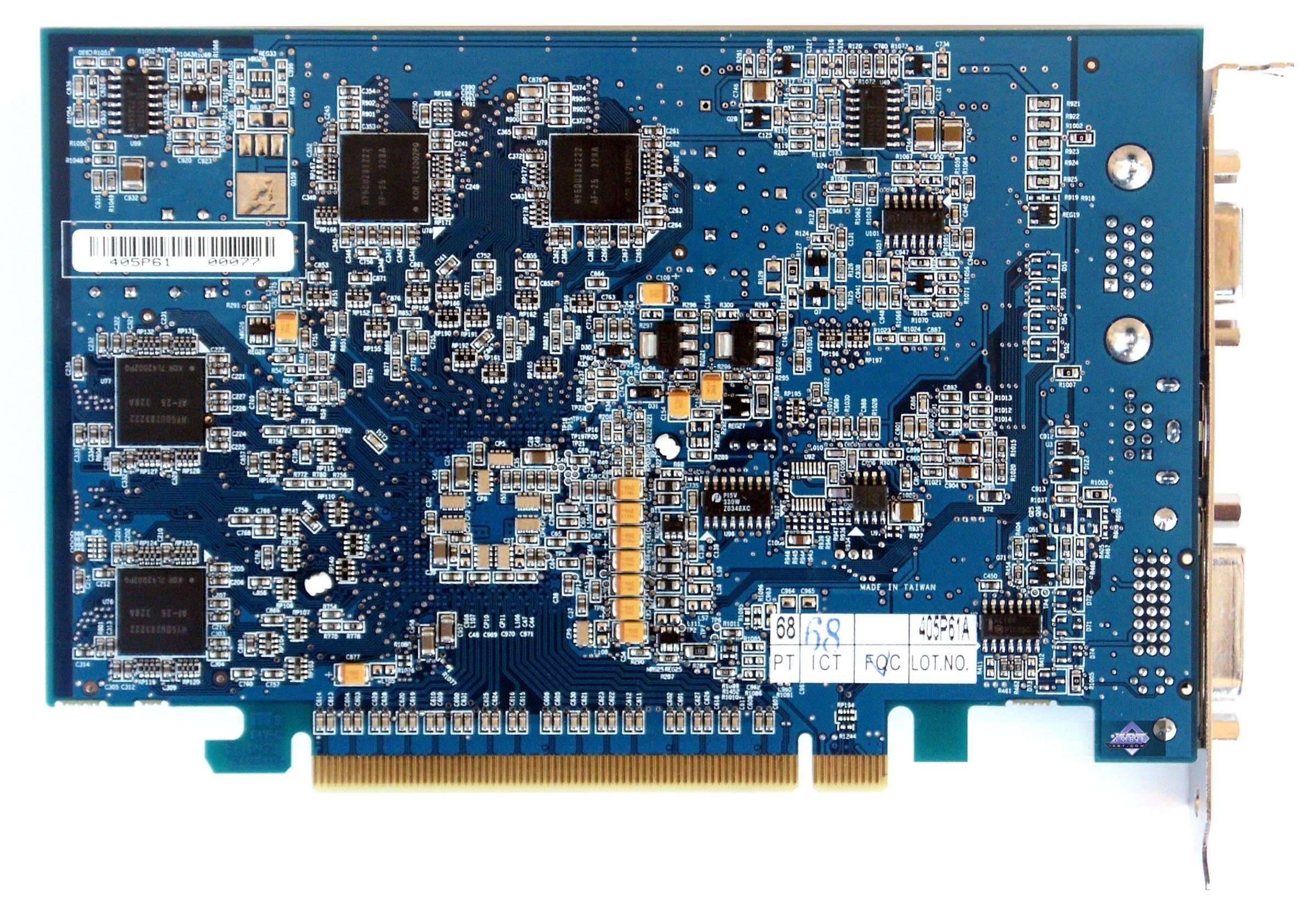 | Карты имеют интерфейс PCI-E x16, 128 МБ памяти DDR SDRAM, размещенной в 8-ми микросхемах на лицевой и обратной сторонах PCB. Микросхемы памяти Hynix. Время выборки у микросхем памяти 2,5 ns, что соответствует частоте работы 400 (800) МГц, память же работает на частоте 380 (760) МГц (заметим, что частота повыше, нежели было обещано ранее — 340 МГц). Частота работы GPU 500 MHz. Шина обмена с памятью — 128 bit. Число пиксельных конвейеров x число текстурников — 4x1. | ![]() |