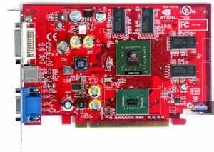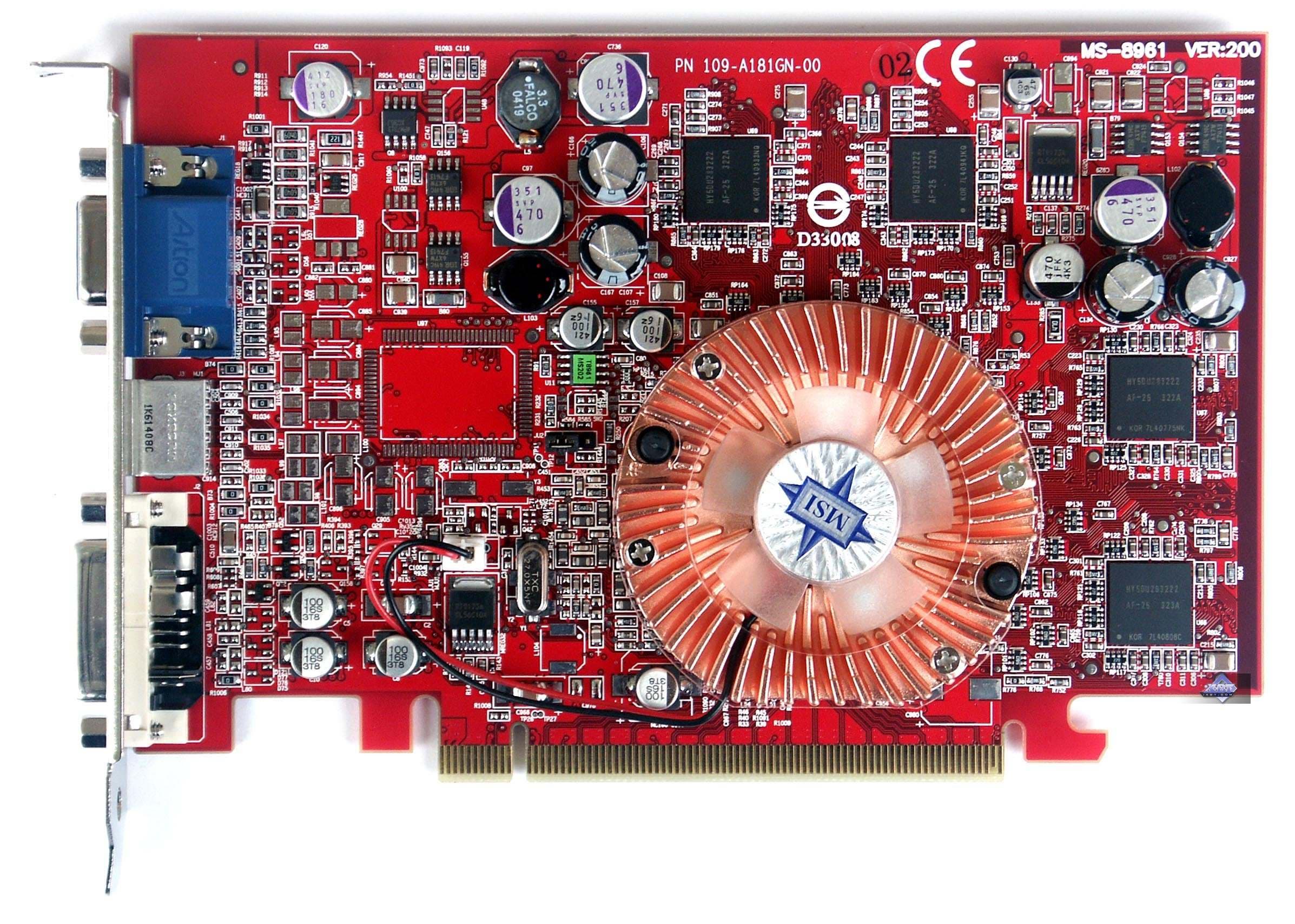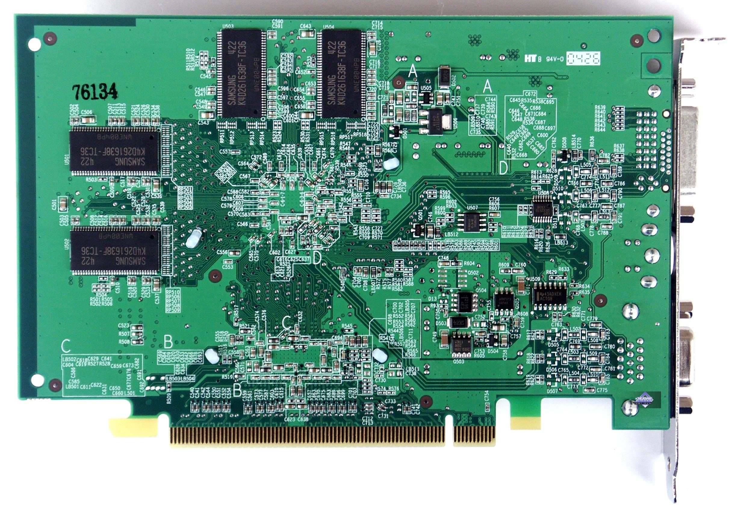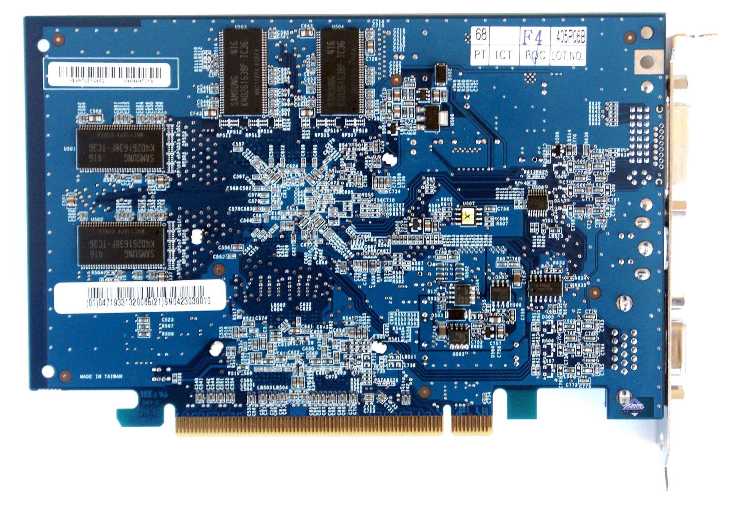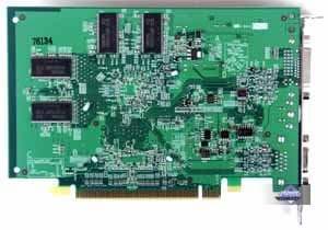 | Карты имеют интерфейс PCI-E x16, 128 МБ памяти DDR SDRAM, размещенной в 8-ми микросхемах на лицевой и оборотной сторонах PCB. Микросхемы памяти Samsung. Время выборки у микросхем памяти 3,6 ns, что соответствует частоте работы 275 (550) МГц, память же работает на частоте 250 (500) МГц. Частота работы GPU 425 MHz. Шина обмена с памятью — 128 bit. Число пиксельных конвейеров x число текстурников — 4x1. | ![]() |