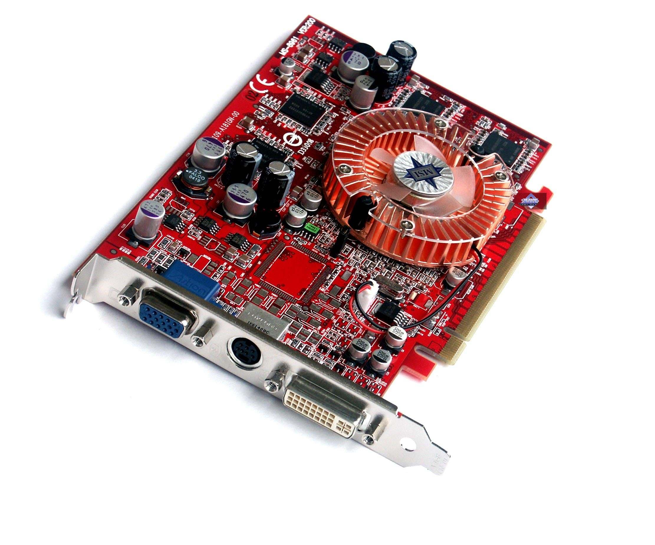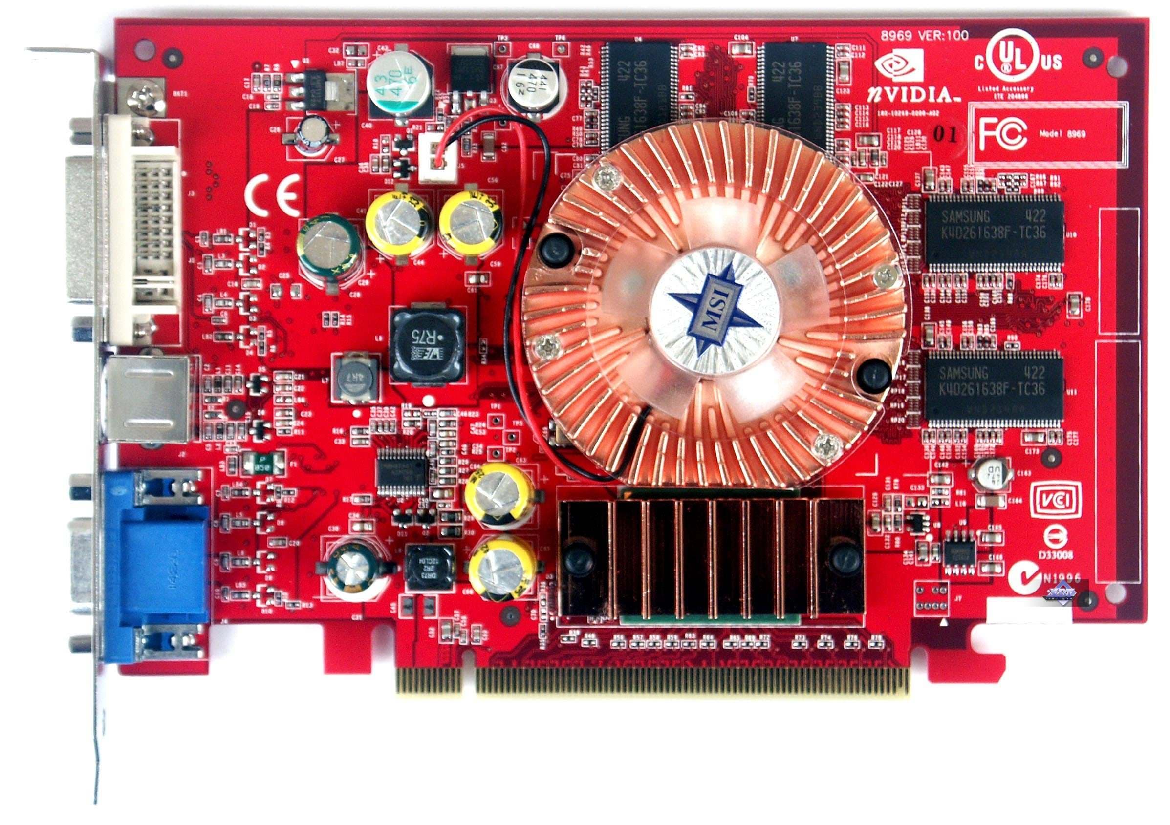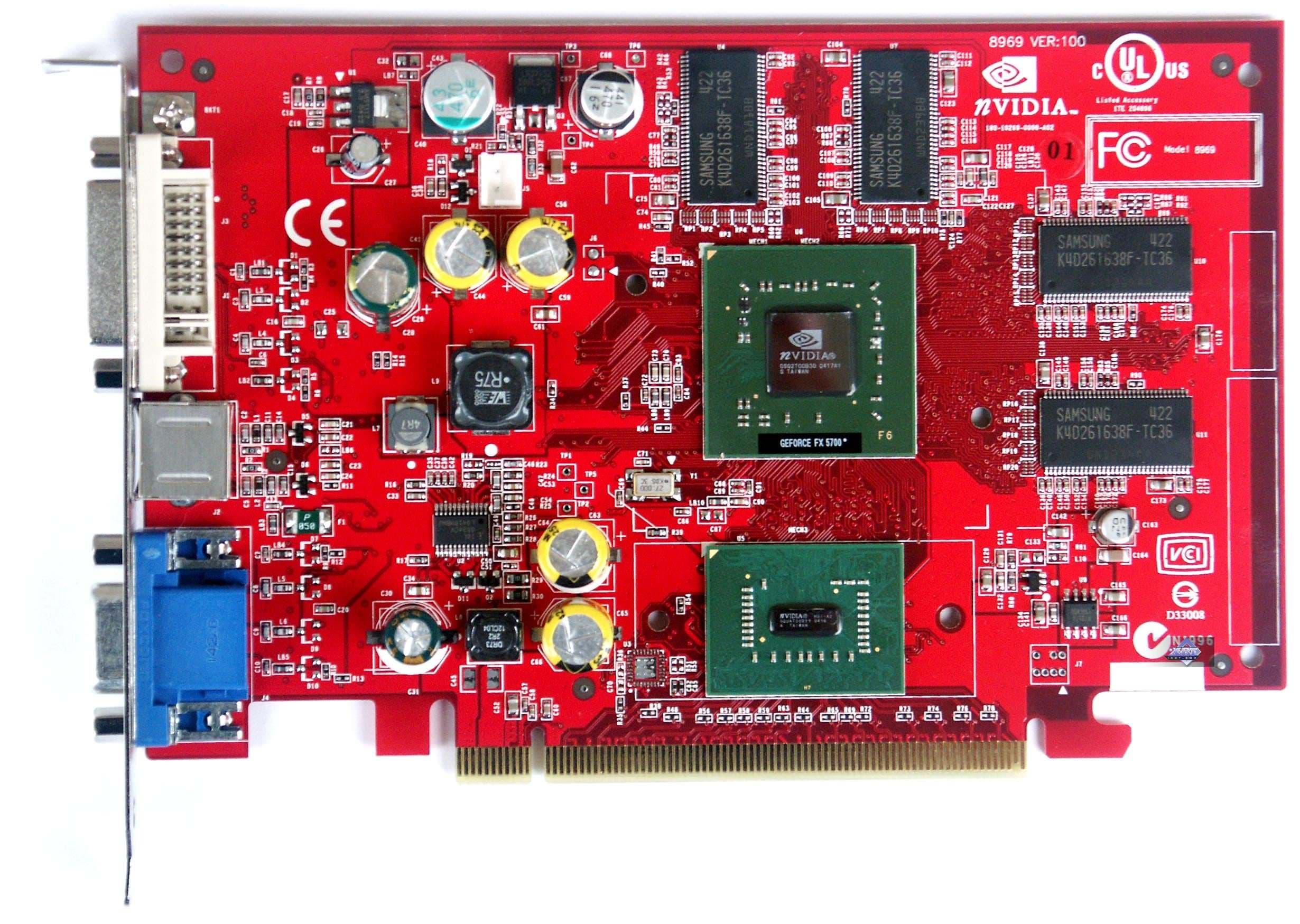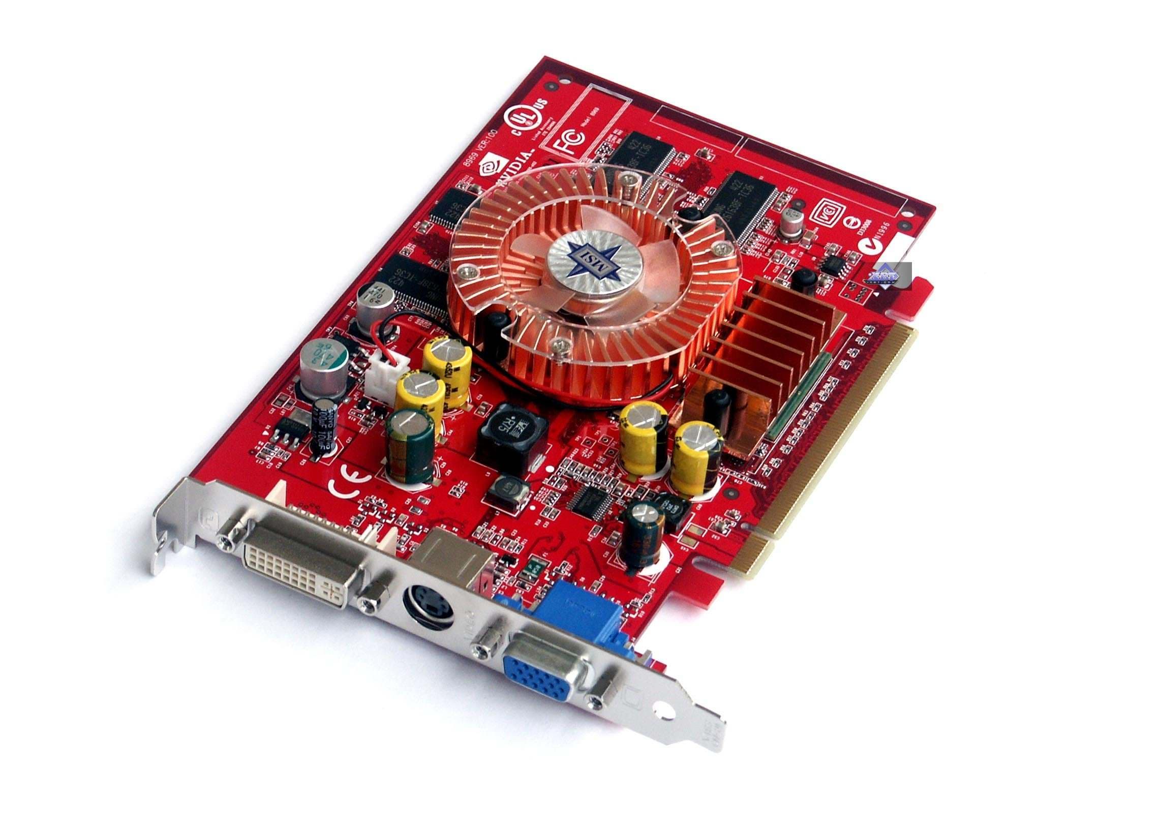| Карты имеют интерфейс PCI-E x16, 128 МБ памяти DDR SDRAM, размещенной в 8-ми микросхемах на лицевой и оборотной сторонах PCB. Микросхемы памяти Samsung. Время выборки у микросхем памяти 3,6 ns, что соответствует частоте работы 275 (550) МГц, память же работает на частоте 250 (500) МГц. Частота работы GPU 425 MHz. Шина обмена с памятью — 128 bit. Число пиксельных конвейеров x число текстурников — 4x1. | ![]() |