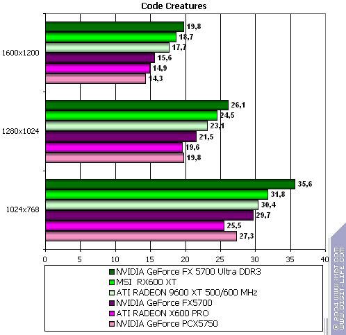 - Code Creatures Benchmark Pro (CodeCult) игровой тест, демонстрирующий работу платы в DirectX 8.1, Shaders, HW T&L.