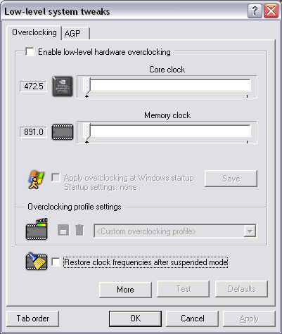 К сожалению, карта практически не разгоняется, изменение частот даже на малые интервалы приводит к их сбросу драйвером.