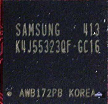 | Микросхемы памяти Samsung (GDDR3). Время выборки у микросхем памяти 2,0 ns, что соответствует частоте работы 500 (1000) МГц, память же работает на частоте 445 (890) МГц. Частота работы GPU 475 MHz. Шина обмена с памятью — 256 bit. | ![]() |