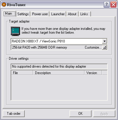 Теперь по разгону. Благодаря оперативности автора RivaTuner Алексея Николайчука, эта утилита уже умеет определять частоты у R420. И вот что мы видим у X800 XT:
