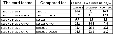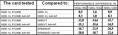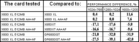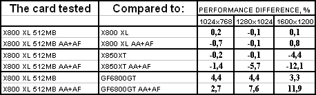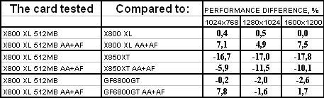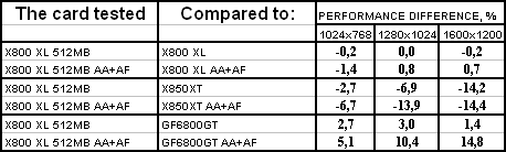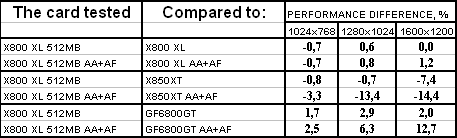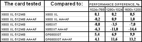 В остальных тестах наличие вдвое большего объема памяти у X800 XL никак не сказалось. Разве что в 1600х1200 в CR в одном из тестов мы видим прирост в 11%.