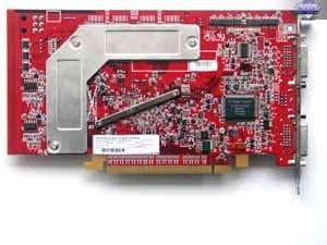 Прекрасно видно, что новинка от своего ранее выпущенного собрата отличается только увеличенным вдвое количеством микросхем памяти, остальное, по сути, без изменений. Благодаря тому, что разводка PCB с самого начала предусматривала возможность установки гнезда для внешнего (дополнительного) питания, проблем с этим не возникло: из-за увеличенного энергопотребления памятью пришлось вернуть обратно снятый ранее на X800 XL 6-пиновый разъем питания, поэтому такие карты потребляют уже больше 75Вт.
