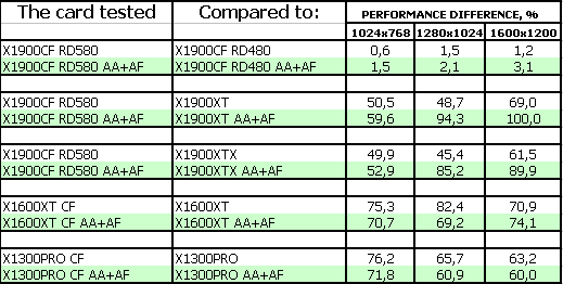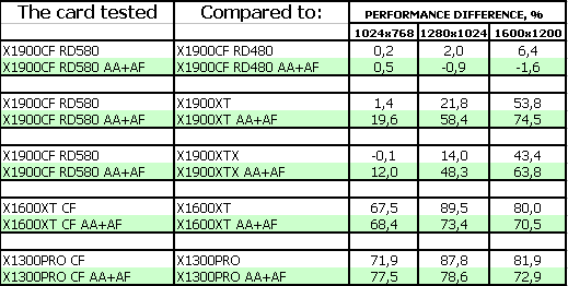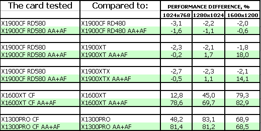 Еще раз подчеркну, что в данном материале мы изучаем не только X1900-карты, но и работу CrossFire на RD580, поэтому приведем данные и по тестам X1300 CF/X1600 CF. Объясню, почему указаны старые версии драйверов. Я напомню, что материал по RD580 вышел 1 марта, и все нижеприведенные тесты были проведены в конце февраля, а тогда были в релизе только CATALYST 6.2 и ForceWare 81.98. После смены BIOS у системной платы, я провел тестирование, разумеется, уже на новых версиях драйверов, но почти никакой разницы, с точки зрения работы CrossFire, по сравнению с ранее полученными результатами, замечено не было, поэтому приводим полностью сведения о том, февральском тестировании, которые справедливы и сегодня. Разница лишь в том, что ПРОПАЛИ АРТЕФАКТЫ, о которых мы говорили в статье по RD580.