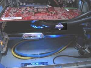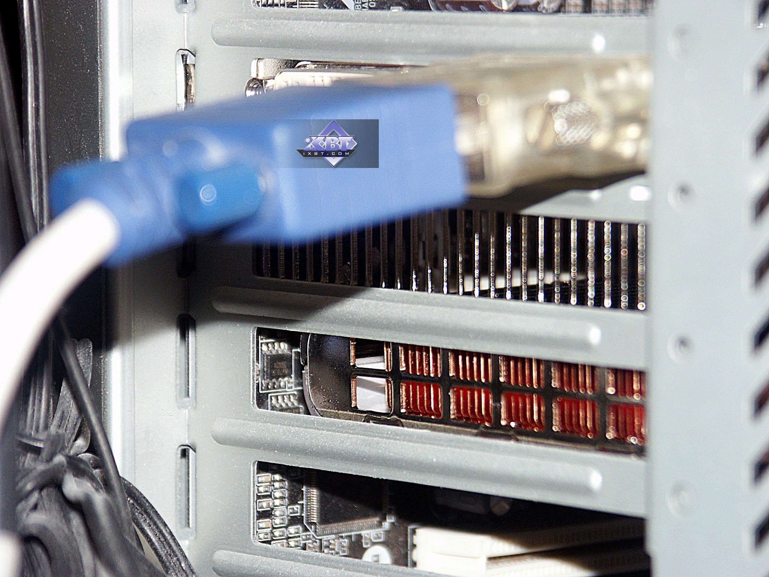 А изюминка Blizzard (в дальнейшем TOXIC) — это как раз устройство охлаждения. Оно очень похоже на то, что мы когда-то рассматривали производства Thermaltake. То есть, основано на водяном принципе. На карте установлен охлаждающий ядро сердечник, который трубками соединен с большим расширительно-охлаждающим блоком, представляющим собой почти целую видеокарту по размерам и занимающий дополнительный слот в системном блоке. У карты, что была у нас в лаборатории, к сожалению, не был заменен двухслотовый брекет, который теперь не нужен. Но в серию карты пойдут с однослотовым брекетом, и поэтому расширительный блок можно установить следом после видеокарты в следующий слот, и таким образом, в целом Blizzard (в дальнейшем TOXIC) не займет места больше, чем reference.