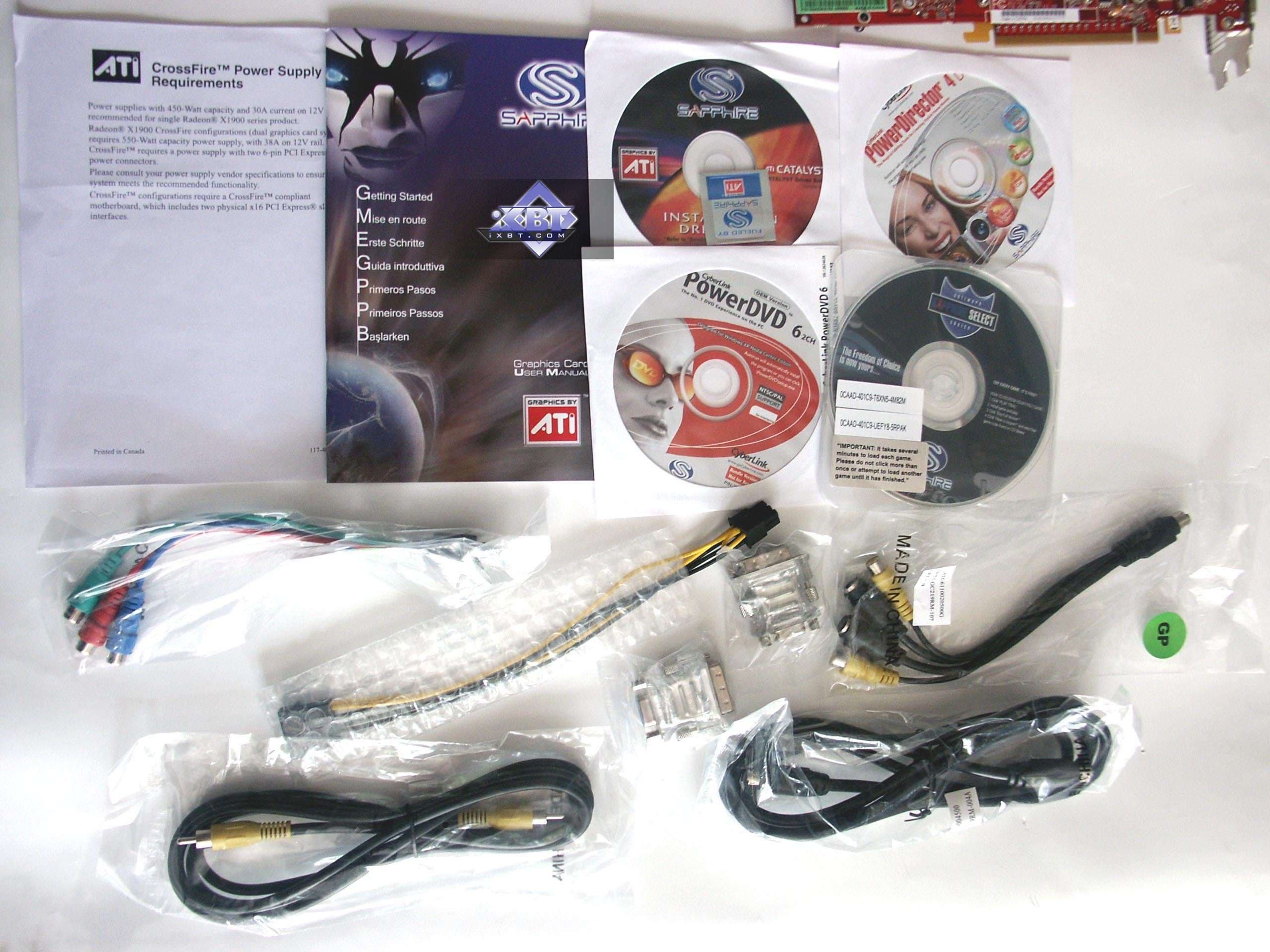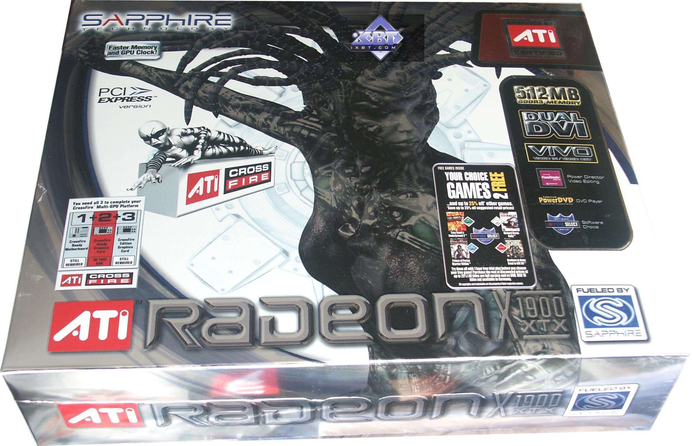 - Sapphire RADEON X1900 XTX 512MB PCI-E — обычный референс. Повторю, наверное, в десятый раз, что никто Х1900 самостоятельно не выпускает. Поэтому смотрите на цены и выбирайте. Комплект у данной карты очень неплохой.