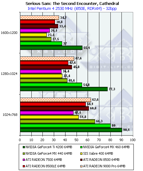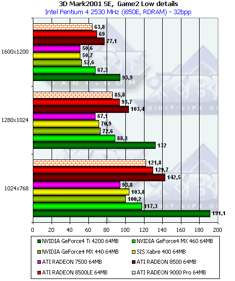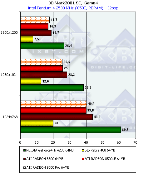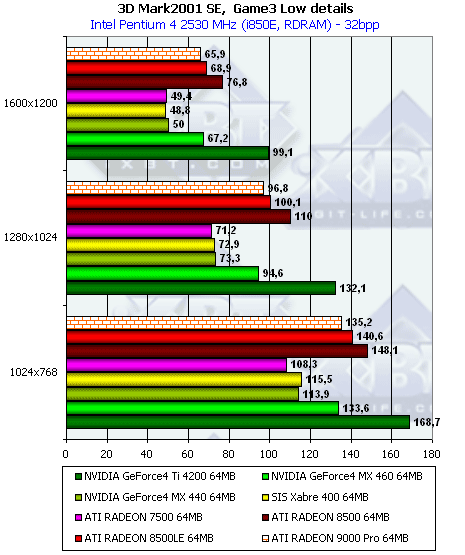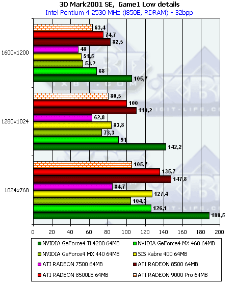 Ну вот, только эта игра дала некоторую фору RADEON 9000 Pro относительно MX 440. Однако радоваться рано: SIS Xabre400 отнял победу у продукта от ATI.