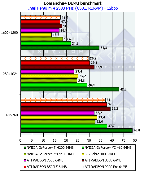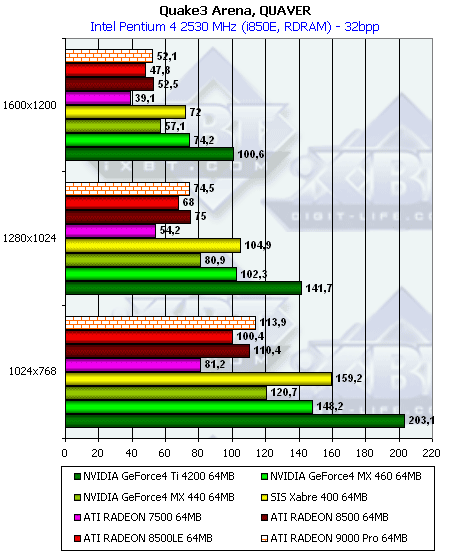В среднем мы видим, что превосходство над MX 440 имеется, а от MX 460 чуть-чуть отстаем, или идем на равных, не считая неиграбельного разрешения 1600х1200. Но зато полноценная победа над Xabre400 :-).