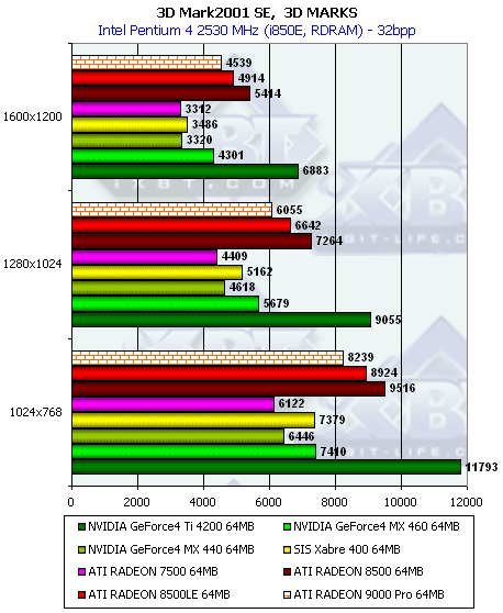 На основании общих "марков" можно отметить, что лидерство RADEON 9000 Pro над GeForce4 MX 440 составляет от 27 до 36%, а над GeForce4 MX 460 от 5 до 11%.