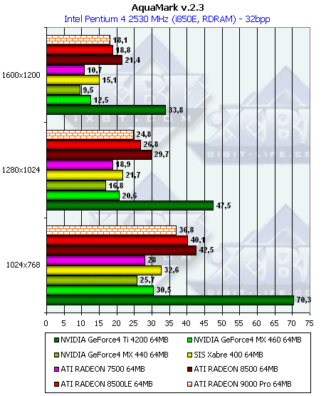 В данном случае возможно лишь сравнение с RADEON 8500LE и Xabre400. И мы видим, что в первом случае результаты практически равны, а во втором Xabre400 очень сильно отстает.