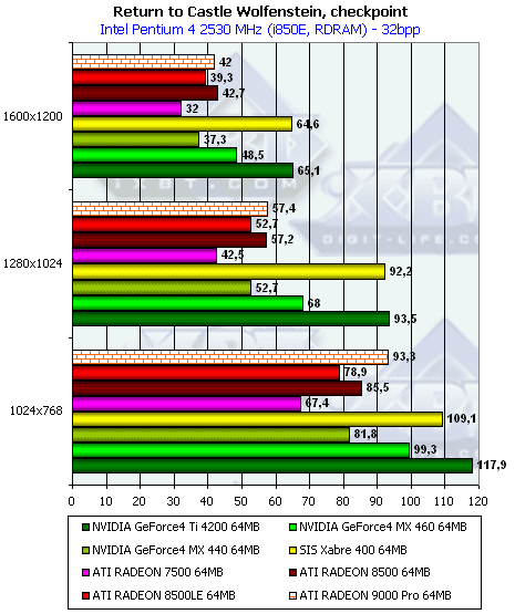 - Return to Castle Wolfenstein (MultiPlayer) (id Software/Activision) OpenGL, мультитекстурирование, Checkpoint-demo, настройки тестирования все на максимально возможном уровне, S3TC OFF, конфигурации можно скачать тут