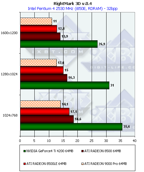 В этом тесте все логично. Несмотря на более высокую скорость работы с пиксельными шейдерами, скорость заполнения сцены у RADEON 9000 Pro сильно меньше, чем у RADEON 8500LE (не говоря уж от RADEON 8500).