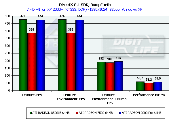 Мы видим, что объект исследования EMBM исполняет даже чуть лучше, чем это делает RADEON 8500, с остальным ситуация практически равновесная.