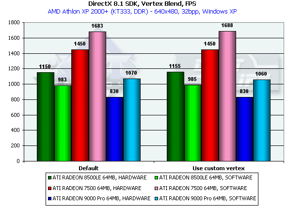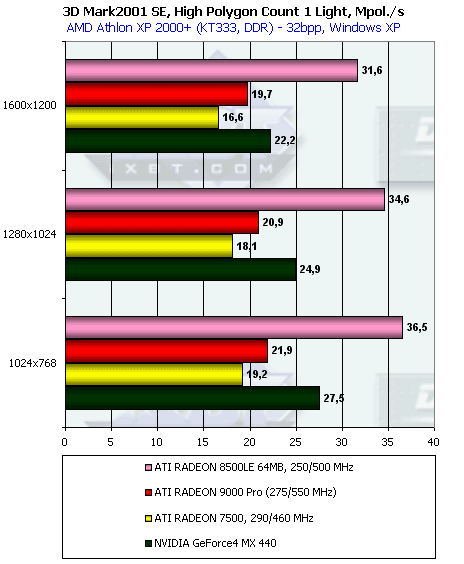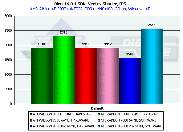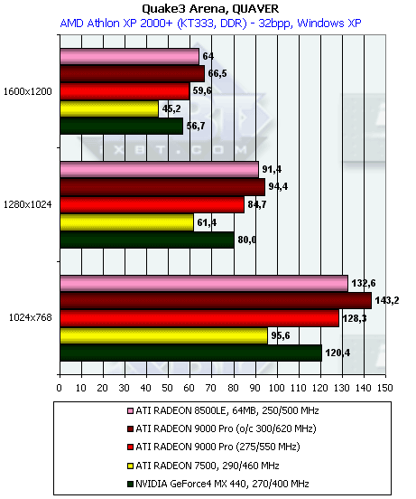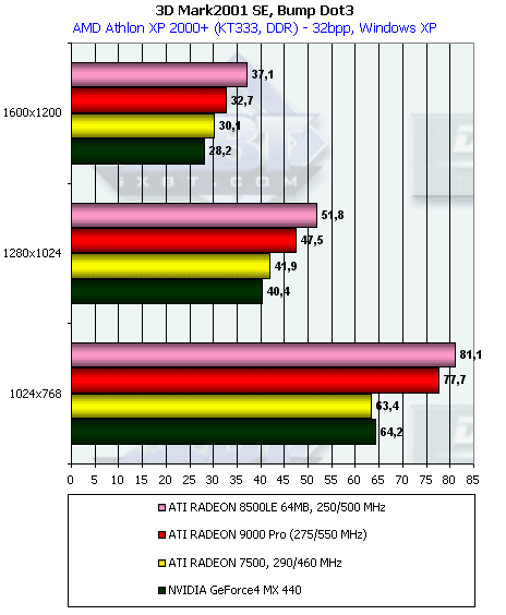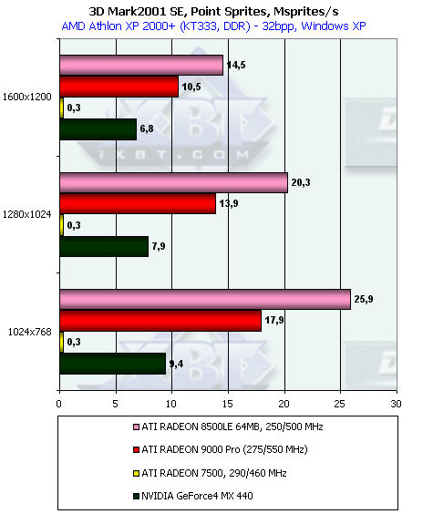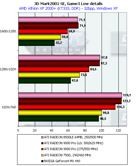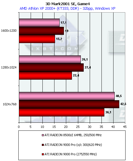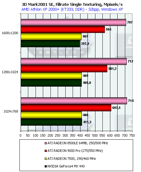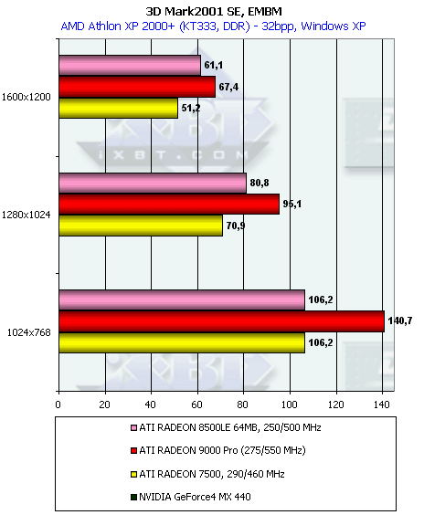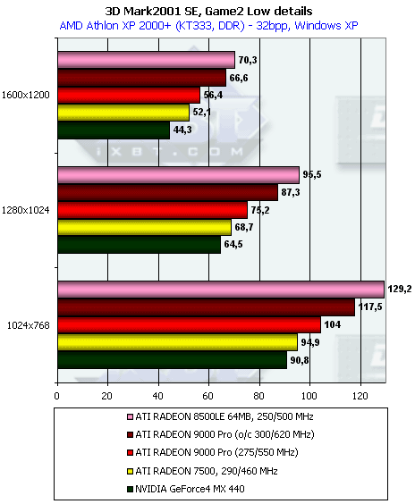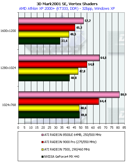 Ну, этот тест всегда бы образчиком полного следования за тем, что акселераторы могут :-). Вот кто сильнее по частотам, конвейерам и т.д. — тот и выигрывает. Интересно отметить, что даже 300/620 МГц у RADEON 9000 не смогли дать карте шанс опередить RADEON 8500.