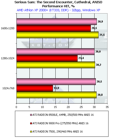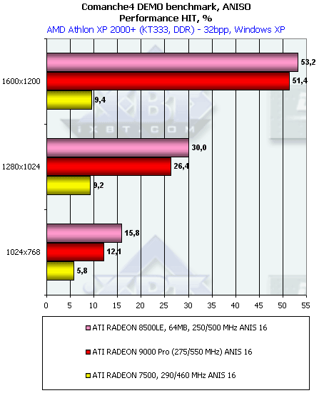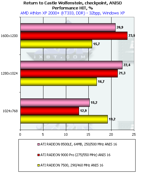 Интересно отметить, что если в плане общей производительности RADEON 9000 ничего нового мы не видим — он почти догнал своего старшего брата — то при активизации анизотропии наблюдается тенденция к резкому увеличению падения скорости по мере роста разрешения. Впрочем, это может объясняться влиянием CPU, от которого данная игра довольно сильно зависит, на младших разрешениях.