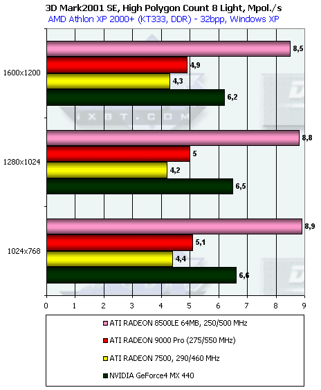 И снова перед нами явно более слабый блок HW T&L у RADEON 9000. Мы видим, что он ослаблен почти в 2 раза по сравнению с RADEON 8500. Впрочем, мы уже выше пришли к выводу, что это вполне логично из-за компромисса между поддержкой старого блока T&L и нового — на шейдерах. Но даже в этом случае производительность подблока освещенности выше, чем у RADEON 7500.