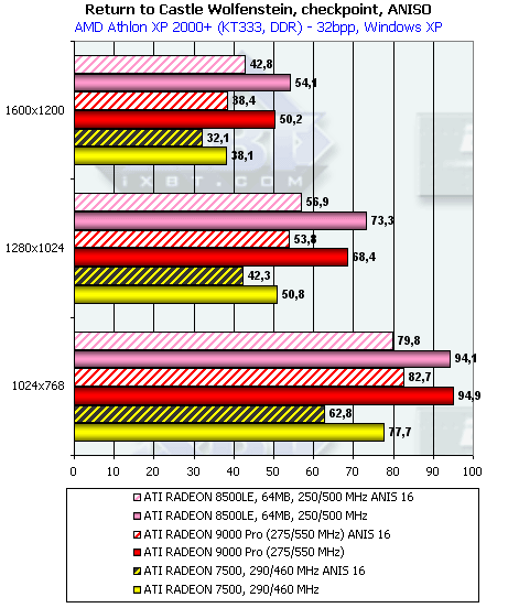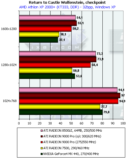 - Return to Castle Wolfenstein (MultiPlayer) (id Software/Activision) — OpenGL, мультитекстурирование, Checkpoint-demo, настройки тестирования — все на максимально возможном уровне, S3TC OFF, конфигурации можно скачать тут