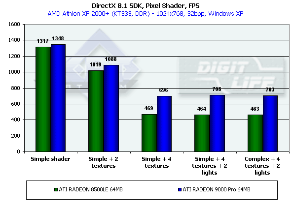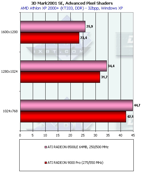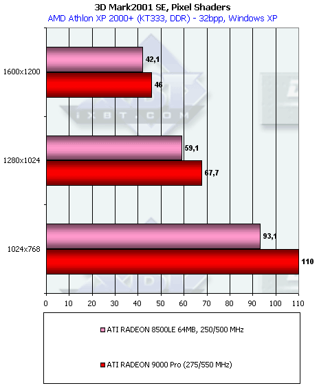 А вот тут мы и видим, что благодаря более высокой скорости работы пиксельных шейдеров RADEON 9000 почти догнал своего старшего брата, несмотря на то, что тест очень сложен, а с текстурниками у нашего подопытного, как известно, туго.