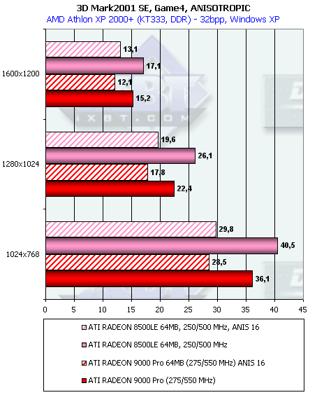 А эта игра умеет накладывать 4 текстуры, поэтому возможности RADEON 9000 использованы более прибыльно, но все равно наличие всего одного блока текстурирования у конвейера отрицательно сказалось на падении производительности при анизотропии.