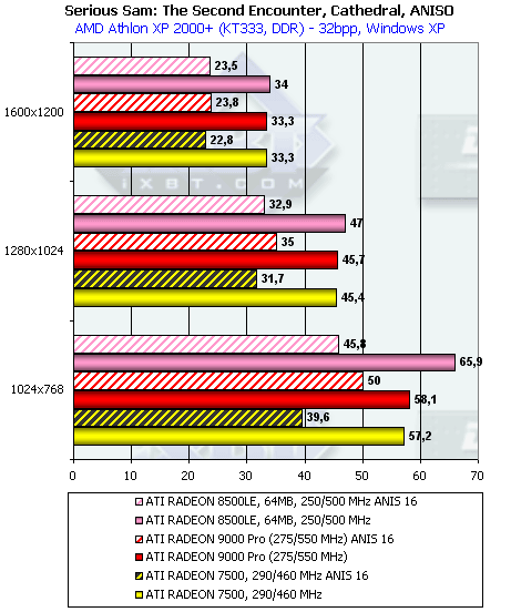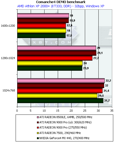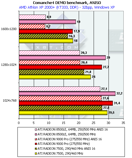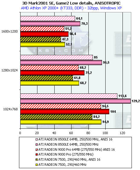 Это очень сложный тест, поэтому всякие "урезанности" у карт выплывают легко. Однако мы видим, что и тут RADEON 9000 показал себя достойно. Правда не совсем понятно — почему такое сильно падение производительности у обоих RADEON 8500/9000 при активизации анизотропии.