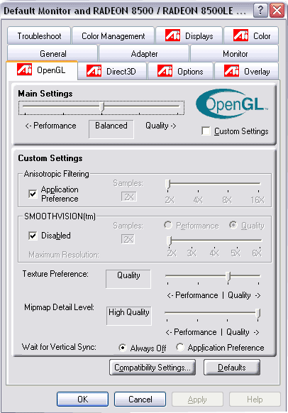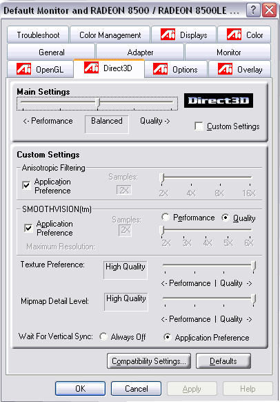 При тестировании наша цель — показ работы карты при максимально возможном качестве (без активизации дополнительных функций, таких, как анизотропия), поэтому все настройки выставляются соответствующим образом. Замечу, что в Direct3D условие максимальной детализации текстур идет по умолчанию.