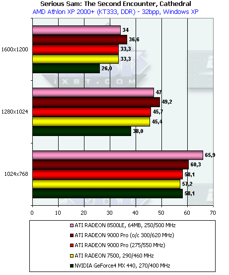 - Serious Sam: The Second Encounter v.1.05 (Croteam/GodGames) — OpenGL, мультитекстурирование, Grand Cathedral demo, настройки тестирования: quality, S3TC OFF
