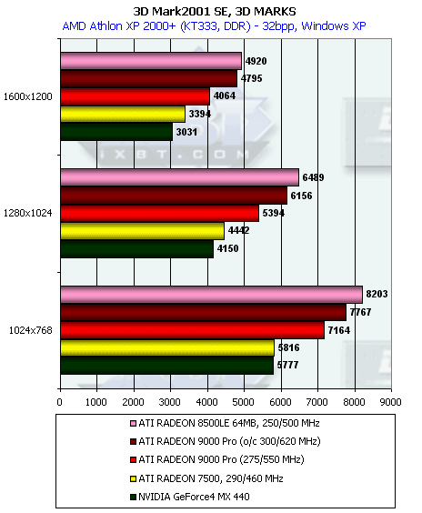 Как и следовало ожидать, на основании общих "марков" можно отметить, что RADEON 9000 находится где-то посредине между RADEON 8500 и 7500, явно выписывая пенсионное удостоверение последнему.