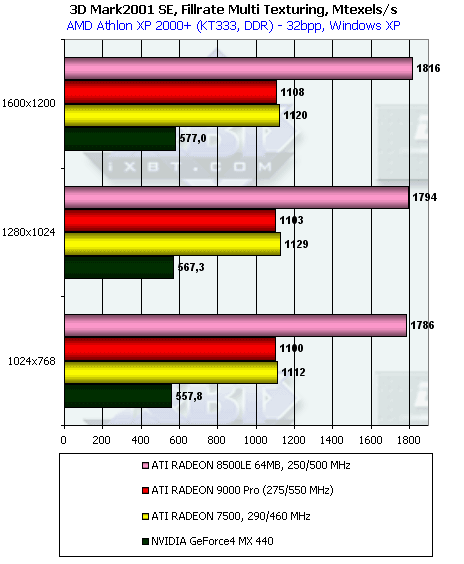 Как видим, при использовании одной текстуры (Single Texturing) сказываются одноканальный контроллер памяти и меньшие кэши. А вот при мультитекстурировании очевидно наличие только одного текстурного блока на конвейер. Падение производительности относительно RADEON 8500 не вдвое, а почти вдвое вызвано сохраненным умением накапливать по 6 текстур за проход. Однако теперь уже жертвовать придется 5-ю тактами, а не двумя, как в RADEON 8500.