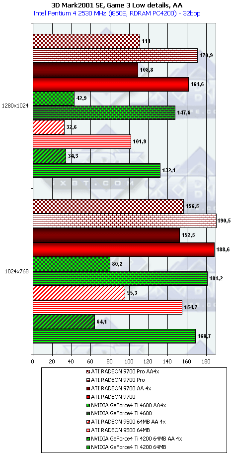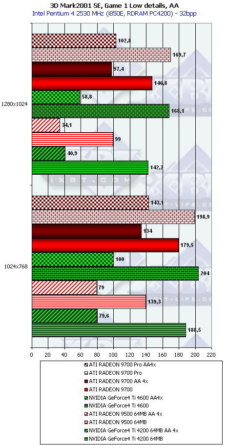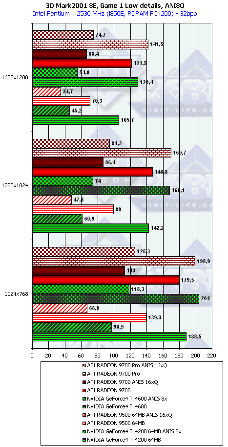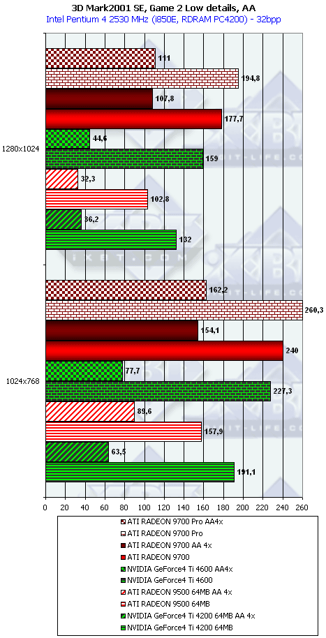 Мы видим великолепные результаты у RADEON 9700 и намного лучшие у RADEON 9500, который, правда, проигрывает без АА и анизотропии, но при активизации любой из этих функций перевес на его стороне.