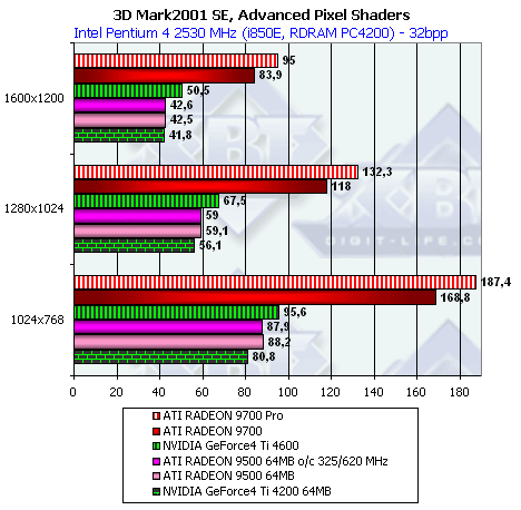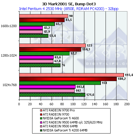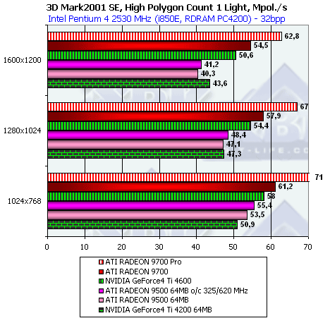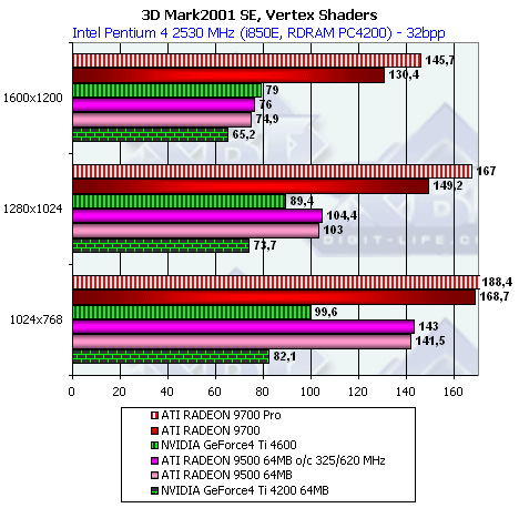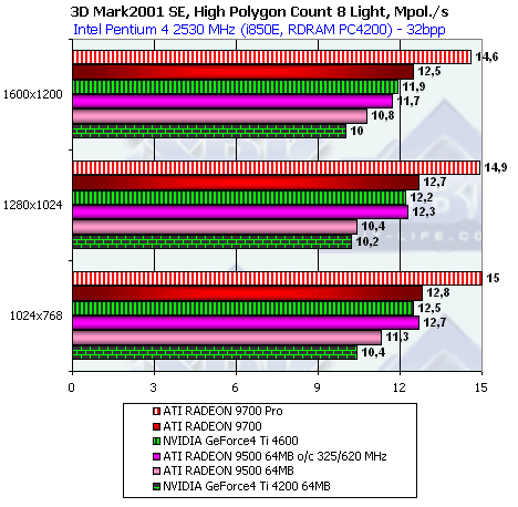 Этот тест зависит в основном от геометрической производительности чипа. Урезанное вдвое по сравнению с RADEON 9700 число пиксельных конвейеров при той же частоте ядра RADEON 9500 не оказывает влияния на этот тест. Мы можем сделать отрадный вывод геометрическая подсистема чипа не была урезана и демонстрирует высокую производительность, опережая (за исключением неоптимизированного случая) даже GeForce Ti 4600.