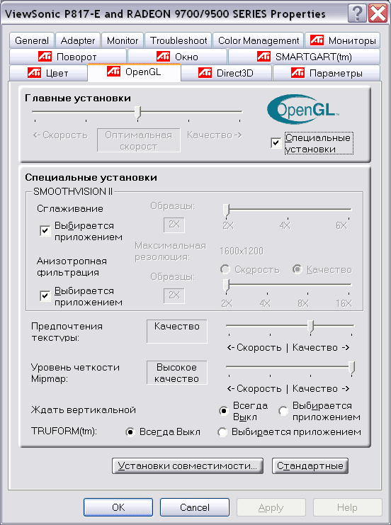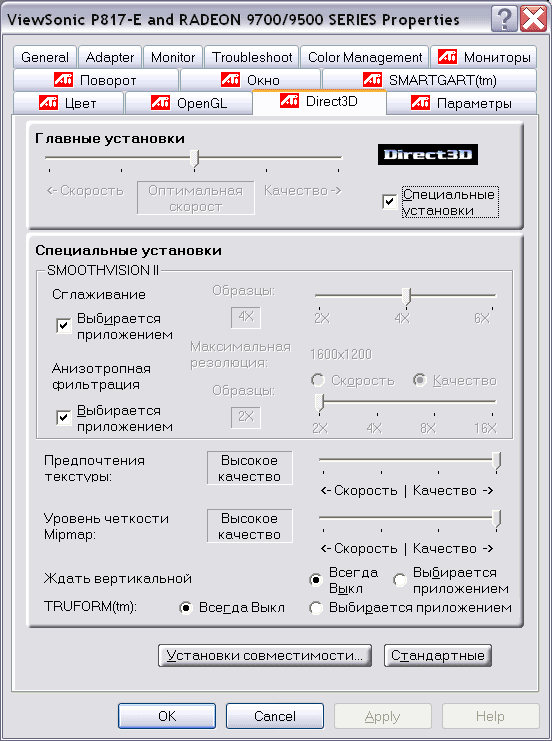 Еще раз отметим, что на сегодня выпущены только драйверы DirectX 8 ! Выход драйверов DirectX 9.0 ожидается только после выхода релиза самого DX9. Что касается настроек управления, то они почти стандартны для всей новой серии драйверов CATALYST, за исключением настроек работы RADEON 9700 в части анти-алиасинга (SmoothVision II) и анизотропии. Как мы видим, у анизотропной фильтрации есть возможность выбора режима ее работы (кроме уровней): производительность/качество. Мы уже подробно рассматривали в обзорах из списка выше, чем эти режимы отличаются (вкратце возможностью/невозможностью функционирования трилинейной фильтрации совместно с анизотропией).