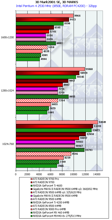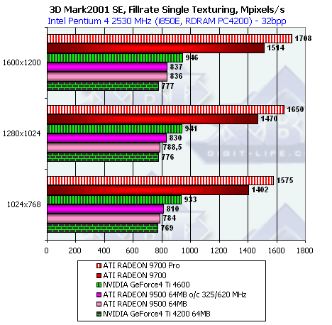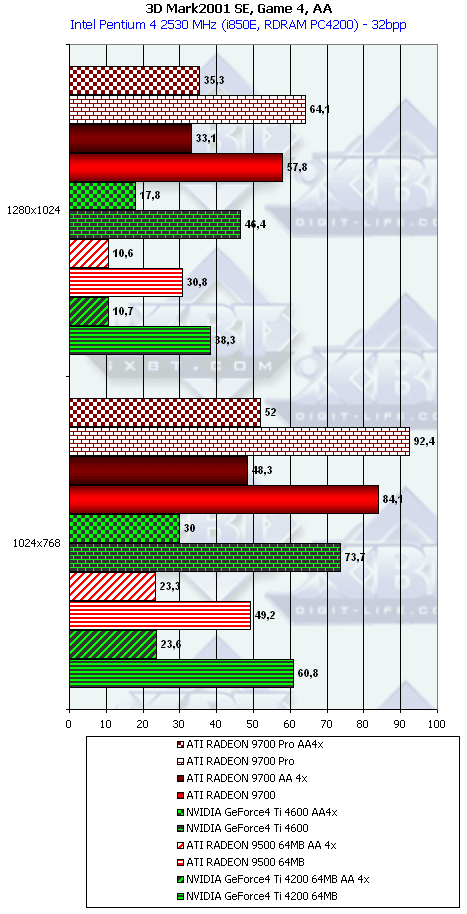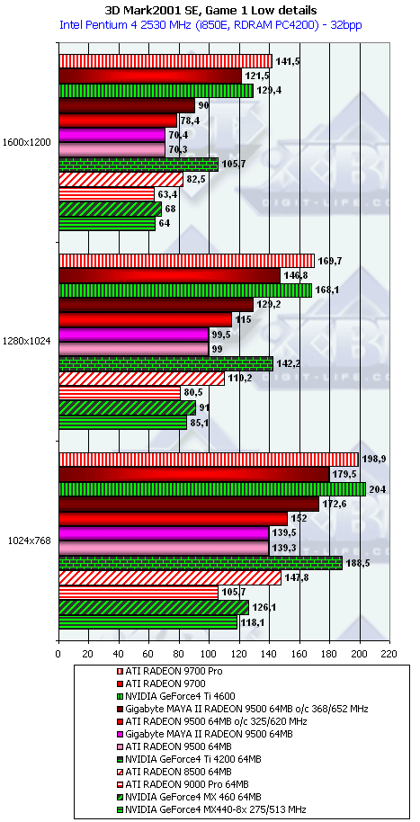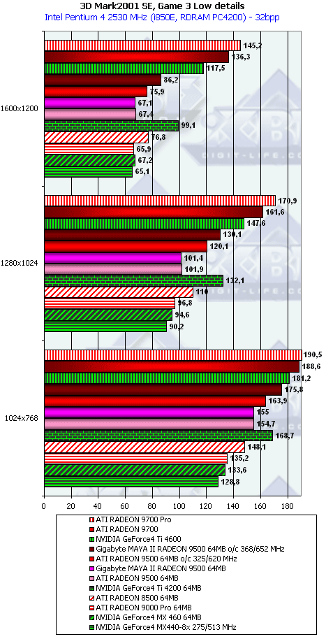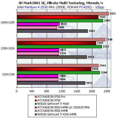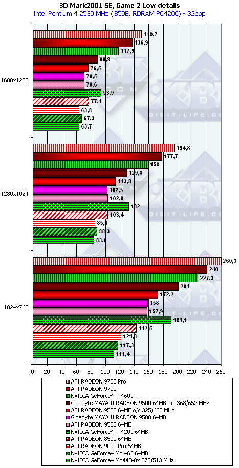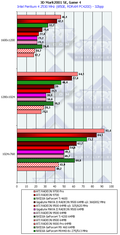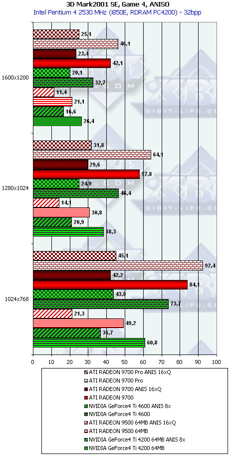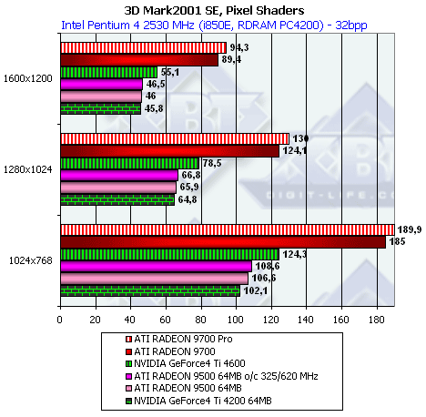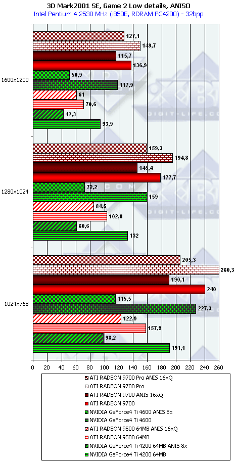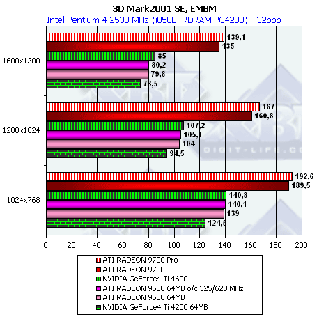 Перед нами небольшой перевес RADEON 9700 над Ti 4600 за счет тяжелых режимов и полный проигрыш RADEON 9500 своему сопернику.
