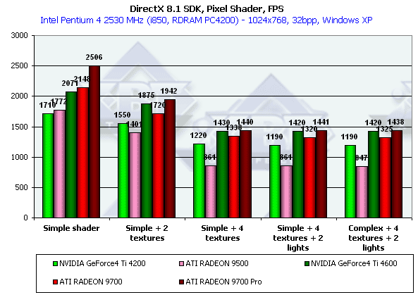 Итак, для тестирования различных предельных характеристик чипов мы использовали модифицированные (для большего удобства и контроля) примеры из последней официальной финальной версии DirectX SDK (8.1).