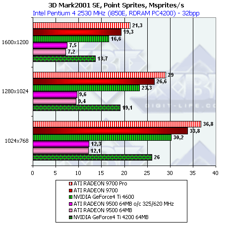 Этот тест никогда не был сильной стороной ATI реализация спрайтов в ее продуктах оставляет желать лучшего. Старичок GeForce Ti 4600 наступает на пятки королю сегодняшнего рынка RADEON 9700 PRO, и это при условии вдвое более узкой шины памяти. А Ti 4200 обыгрывает RADEON 9500 по всем статьям.
