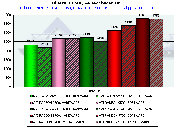 В небольшом разрешении, там, где высокая закраска не так важна (как нам известно из тестов DX8 SDK сравнимая с RADEON 9700) геометрическая производительность RADEON 9500 позволяет ему существенно опережать продукты NVIDIA. В насыщенных геометрией и вершинными шейдерами приложениях в небольшом разрешении продукты нового поколения от ATI будут предпочтительнее продуктов предыдущего поколения от NVIDIA. Но, по-моему, все-таки подозрительно много условий возникает при сравнении предыдущего и текущего поколений. А что будет, когда появится следующее поколение NVIDIA?