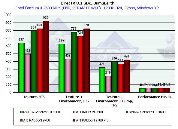 В этом тесте мы измеряем производительность, а точнее ее падение, возникающее при использовании наложения карт среды (Environment) и рельефа на основе карт среды (EMBM Environment Mapped Bump Mapping). Кроме того, мы измеряем филрейт обычного одинарного текстурирования. Тестирование проводилось в разрешении 1280*1024 мы считаем это разрешение оптимальным для предельных тестирований современных карт: