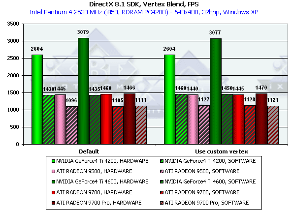 В этом тесте продукты ATI отстают от продуктов NVIDIA вне зависимости от конкретной модели RADEON. Вопрос в подходе к реализации всей функции видимо, у NVIDIA она реализована более успешно. Впрочем, с распространением вершинных шейдеров и DirectX 9.0 возможность жесткого аппаратного блендинга перестанет играть какую-либо роль.