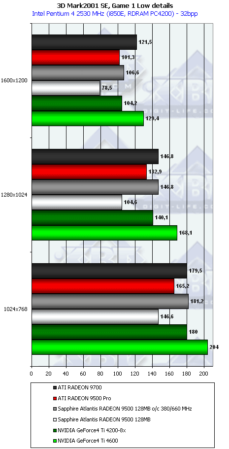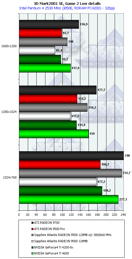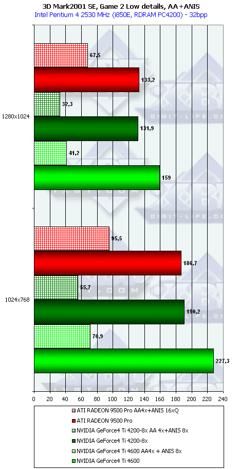 Ну что тут можно сказать? RADEON 9500 PRO прочно занимает свое место между GeForce4 Ti 4200-8x и Ti 4600, а в тяжелых режимах часто кладет на лопатки и Ti 4600. Неплохо для карты за $200?